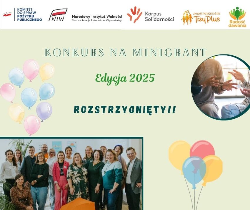 Związek Dużych Rodzin „Trzy Plus” Oddział Wielkopolski z radością ogłasza wyniki konkursu „Minigranty wolontariackie Radość dawania”.