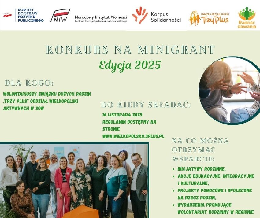 Związek Dużych Rodzin „Trzy Plus” Oddział Wielkopolski zaprasza wolontariuszy ZDR 3 Plus do udziału w konkursie "Minigranty wolontariackie Radość dawania”. Celem programu jest wsparcie inicjatyw społecznych i rodzinnych, rozwijających postawy zaangażowania, współpracy, troski o dobro wspólne.